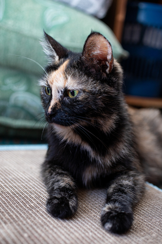Молодую черепаховую кошечку заметили на улице на большом сроке беременности. Её обследовали и забрали на передержку, где она спустя несколько дней родила 4 котят. Сейчас котята подросли, и Черепашка готова к переезду в новый дом. По заключению ветеринара перед родами ей было не больше 1,5 лет. Её обследовали, пролечили от инфекции, обработали от паразитов, запланированы вакцинация и стерилизация. Кошечка очень спокойная и ласковая, любит играть и спать под боком у человека. Терпелива, хорошо ездит в машине. Ест сухой и влажный корм. Приучена к лотку. Пристраивается в добрые руки по договору ответственного содержания.