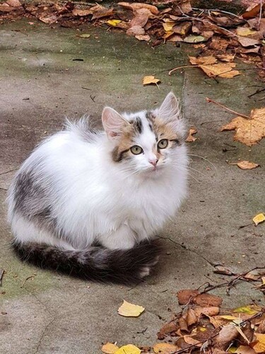 Маленький котёнок (девочка) ищет себе дом. Сейчас малышка живёт на улице, но с наступлением холодов ей некуда спрятаться (в доме, около которого она живёт, нет подвала). Котёнок игривый, но немного настороженный, пока не очень доверяет людям. Любовь и ласка человека растопят её немного суровое сердечко. В еде неприхотливая, очень благодарная. Кошечка очень заботливая, постоянно оберегает своих братьев и сестричек. Трёхцветные кошечки приносят удачу и счастье