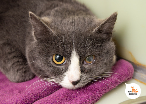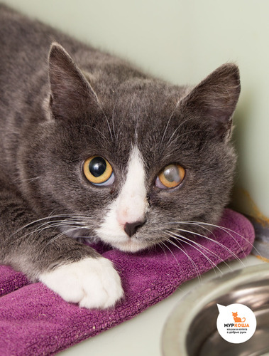 Бельмо на глазу, котенок проходит успешное лечение. Возможно, роговица останется мутноватой, на зрение это не повлияет. Специальный уход не требуется.