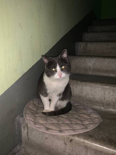 Найден котик, серый с белой грудкой и лапками. Ласковый. Живет в подъезде по адресу: Белореченская 43, подъезд 3. Возможно убежал у кого-то.